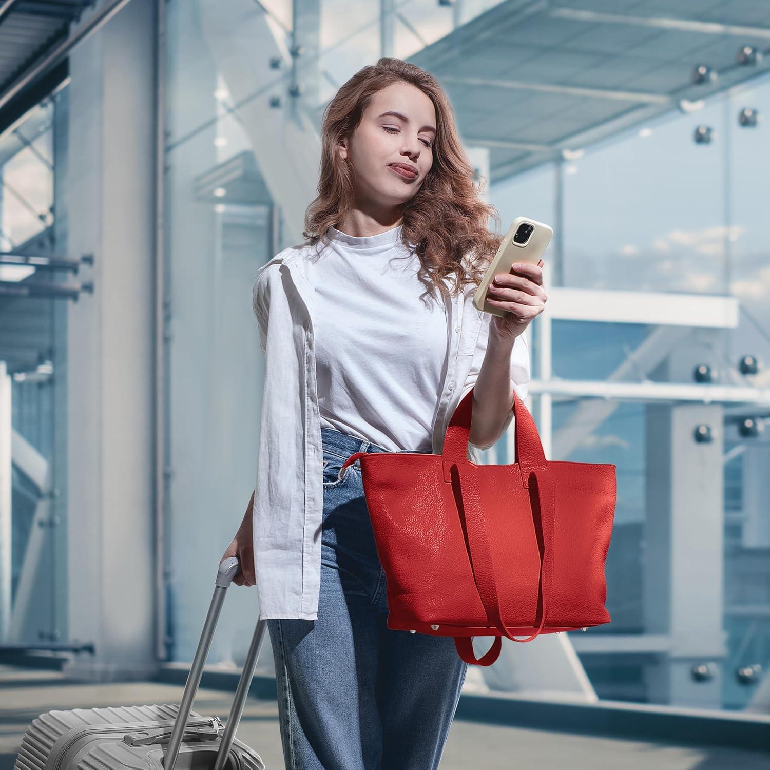 Italian Calf Leather Tote Bag for Women with Zipper & Double Straps | Large Soft Laptop Shoulder Handbag for Work(Red)