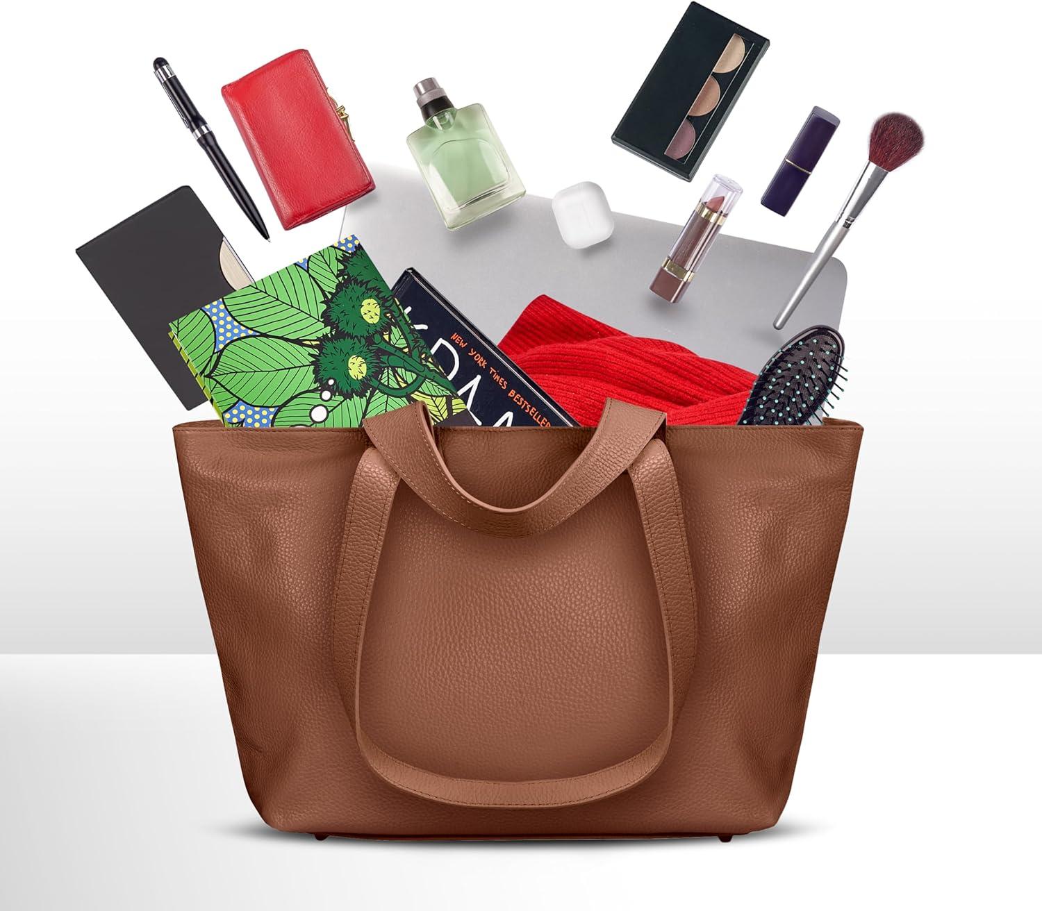 Italian Calf Leather Tote for Women with Zipper, Inner Pocket & Flat Base | Soft Unlined Shopper for Work & Travel(Chocolate)