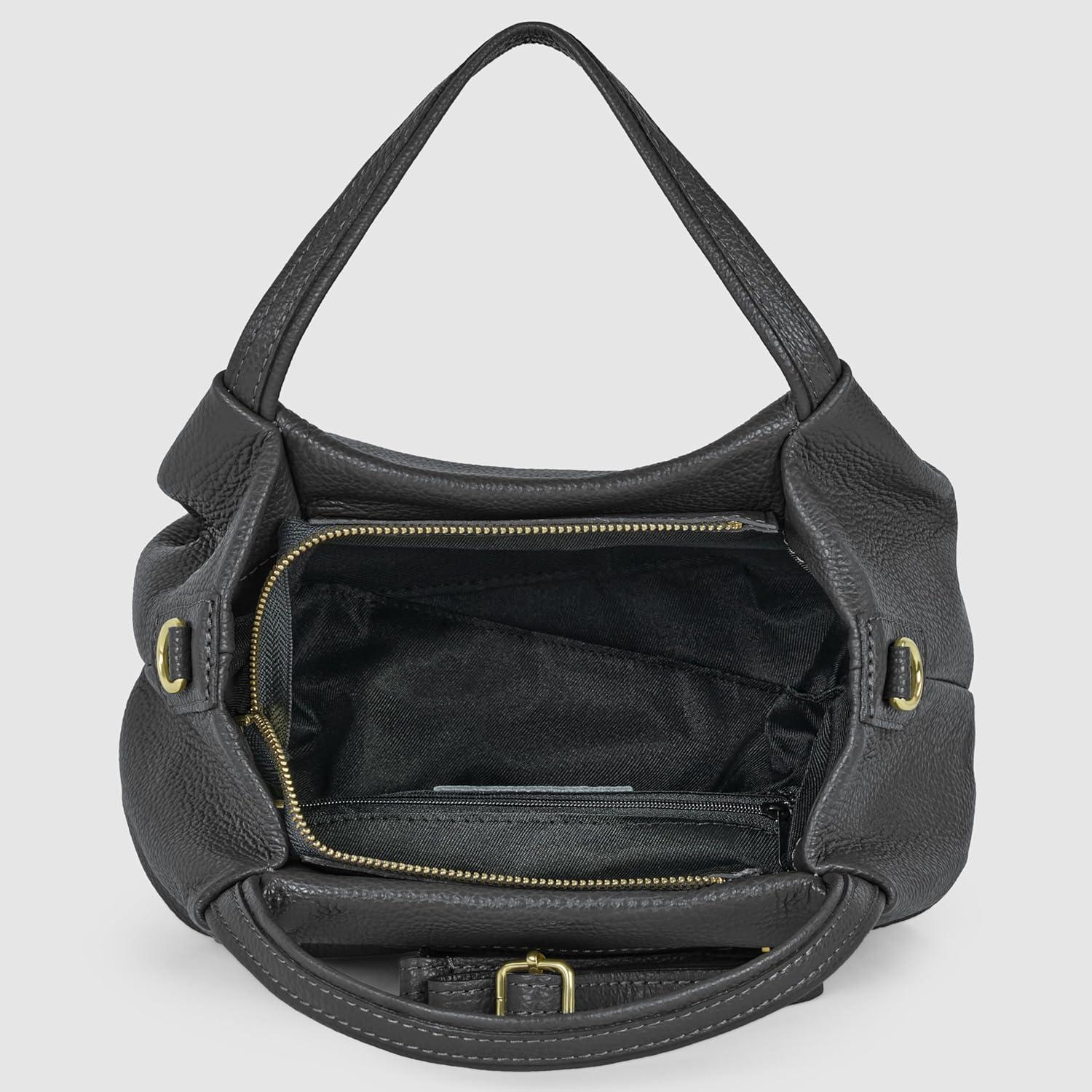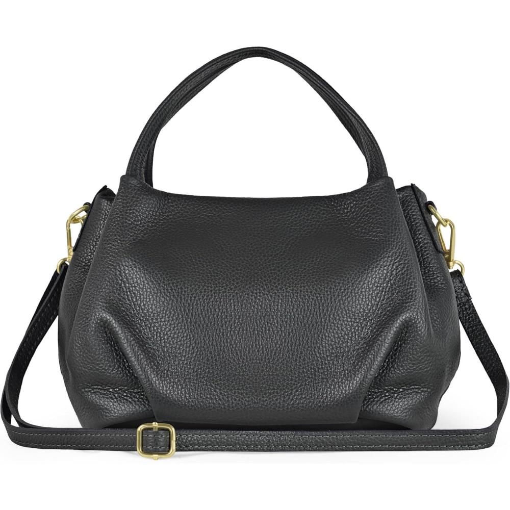 Experience honest luxury with this Italian handbag, crafted in Florence from full-grain cowhide leather with a soft pebbled texture and matte finish. The dumpling-inspired shape is feminine yet practical, with rounded sides and a reinforced base for stability. Inside, a spacious compartment and a zippered pocket keep essentials secure, while a discreet back zipper pocket offers quick phone access. Clean stitching and gold-tone hardware highlight premium craftsmanship, complemented by an embossed leather brand tag. This medium-sized purse measures 11.8″ × 5.1″ × 7.9″ and weighs only 1.2 lb, making it lightweight yet roomy for everyday use. Two rounded top handles blend seamlessly into the body, while a detachable strap lets you wear it on the shoulder or crossbody for travel or work. More than an accessory, this genuine leather satchel reflects timeless Italian handbags tradition. Popular and trendy yet chic and cute, its unique design avoids slouch and elevates every outfit with lasting appeal.