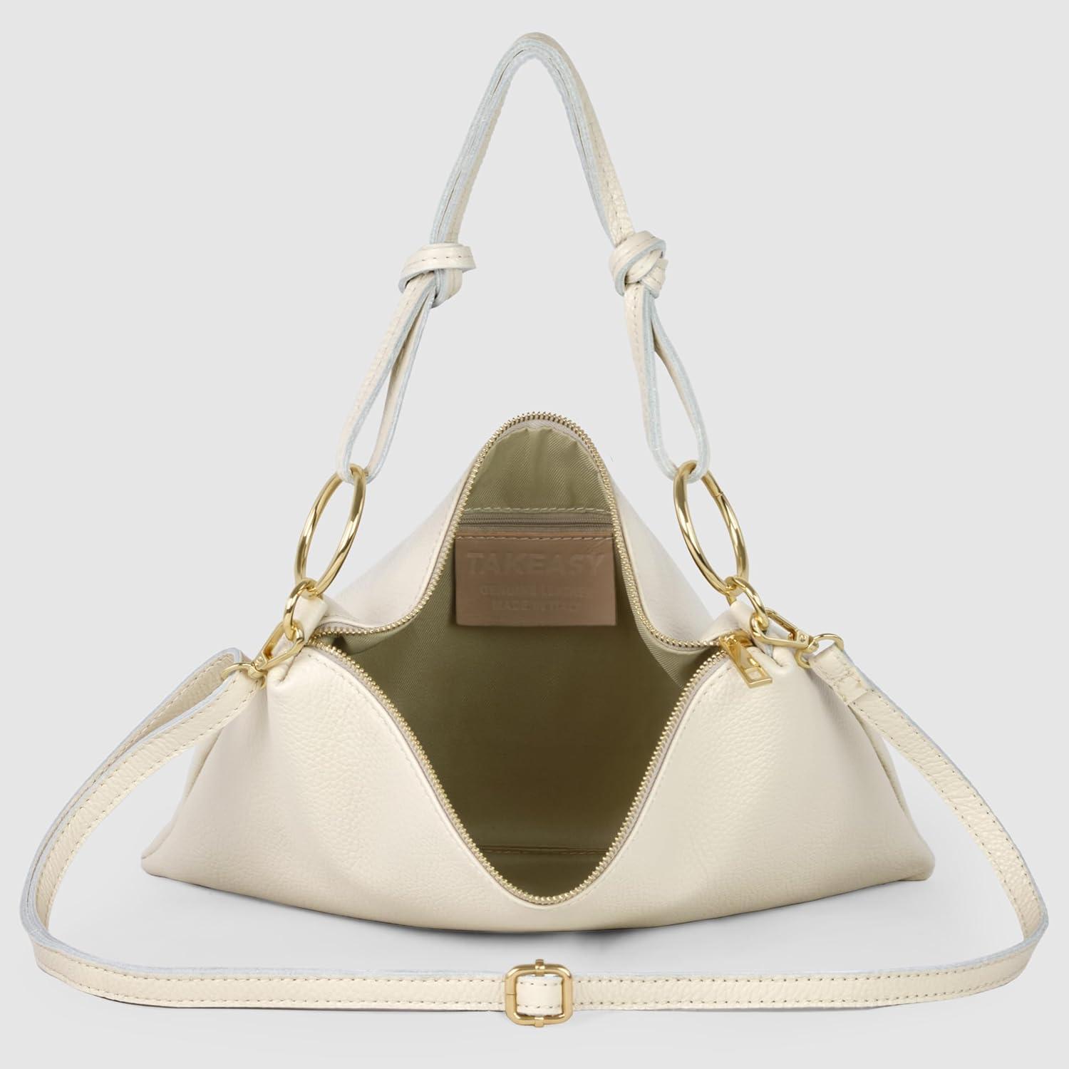 This Italian leather purse features a softly structured crescent silhouette crafted from genuine calfskin with a natural grain and matte finish. The non-laminated surface keeps a supple touch, while the semi-rigid build holds its shape with slight pliability. Compact in size (9.8″” L × 3.1″” W × 5.1″” H, 12.3 oz), it is light yet structured for everyday use. Two detachable straps allow versatile styling: a short handle with gold-tone clasps for hand, elbow, or shoulder carry, and a longer adjustable strap for crossbody or shoulder wear. Conical leather accents at the handle base and polished gold-tone hardware highlight refined artisanal detail. The bag closes with a smooth gold-tone zipper. Inside, a polyester twill lining ensures durability, featuring one main compartment and a flat zip pocket for essentials like keys, cards, or earbuds. Precision stitching completes the clean design and timeless Italian style.