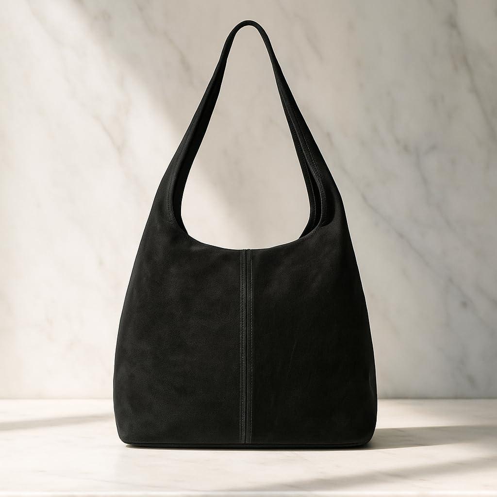 Italian Genuine Suede Hobo Bag for Women with Zipper and Single Strap | Large Soft Slouchy Shoulder Handbag Purse(Black)