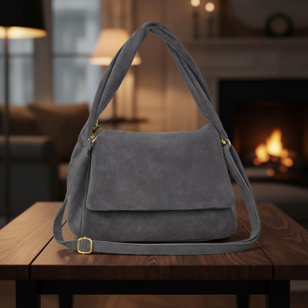 Luxurious Italian suede handbag that merges refined design with everyday practicality. Crafted from genuine Florentine suede, this midsize designer satchel has a smooth velvety texture and structured rectangular shape, offering a perfect size for daily essentials. The magnetic flap, twisted handle, and gold-tone hardware reflect pure Italian craftsmanship. The body remains softly flexible while holding its elegant silhouette. Inside, a twill lining with one roomy compartment and a zip pocket keeps everything neatly organized. Adjustable strap allows versatile styling — wear it crossbody, on the shoulder, or carry by hand. Ideal for ladies who love original, affordable luxury, it suits urban fashion trends, work meetings, or weekend shopping. Cool, trendy, and timeless — a designer piece that elevates your everyday look with understated elegance and comfort.