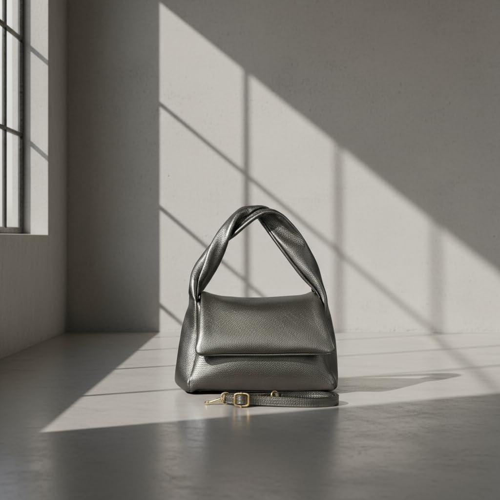 Discover the pure elegance of Italian design with this midsize genuine leather purse – a cool, urban piece that captures current fashion trends while staying timeless. Handmade in Florence from genuine calf leather with a smooth laminated surface, it offers a subtle glossy sheen and high-quality finish. Despite its compact size, the bag is perfectly proportioned for everyday shopping, business, or evening outings. Inside, a lined compartment and zip pocket keep essentials neatly organized. Gold-tone hardware, twisted handle, and magnetic flap closure showcase authentic craftsmanship. This trendy yet affordable luxury handbag blends structure and softness, making it ideal for modern women who value both style and function. Whether paired with a blazer or jeans, the pebbled-like texture and polished shine reflect effortless Italian sophistication.